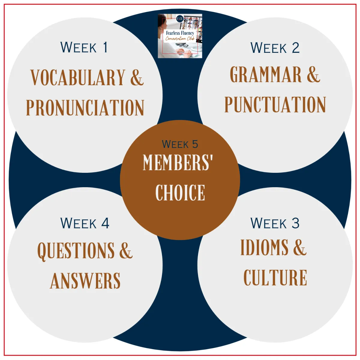 All meetings are an hour long and will be held every Thursday at 2:00 PM, Eastern Time. These meetings will be recorded and available in the Learning Tab of the Fearless Fluency Conversation Club membership portal.